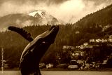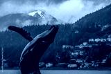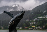 Grey, misty, foggy morning in Juneau Bay, Alaska with small islands channel cruising and houses, glacier mountains and low clouds