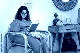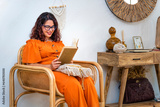 Young book lover girl reading in her armchair.