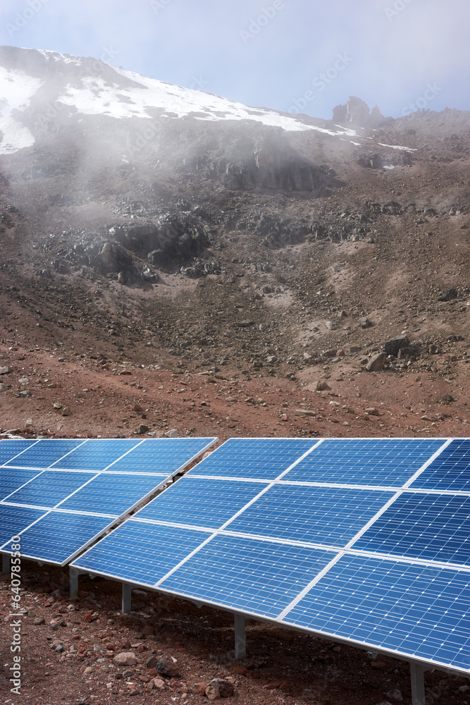 Solar panels with Chimborazo volcano in background, selective focus, Ecuador.