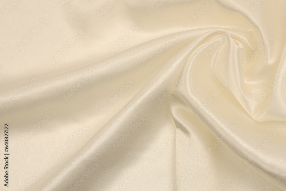 Beige white pearl wave silk fabric. Abstract texture horizontal copy space background.