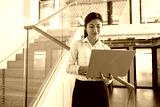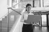 Smiling business woman working on laptop while standing on office background. High quality photo