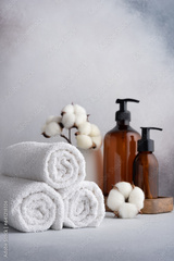 Stack of rolled white towels and dispenser bottles for spa and bathroom