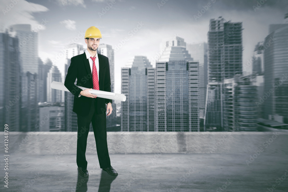 Male architect carrying a blueprint while standing on top floor with city buildings background