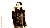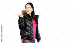 Profile side view portrait of attractive cheerful Asian girl demonstrating copy space