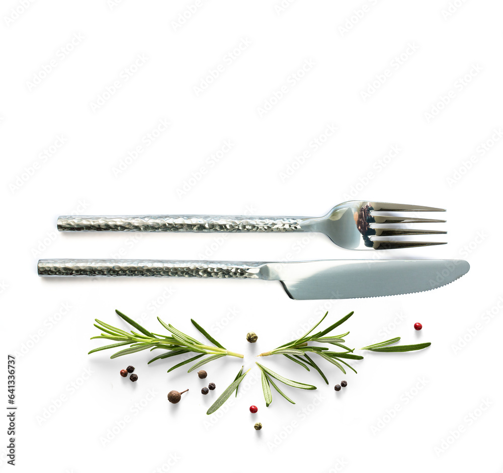 Food poster with cutlery and fresh mediterranean herb and spices with real transparent shadow isolated on transparent background. PNG cooking background design element