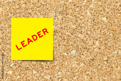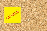 Yellow note paper with word leader on cork board background with copy space
