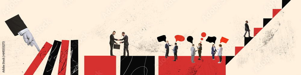 Contemporary art collage of business people, team work on start up progress using analysis, communication and going up on career stairs.
