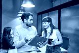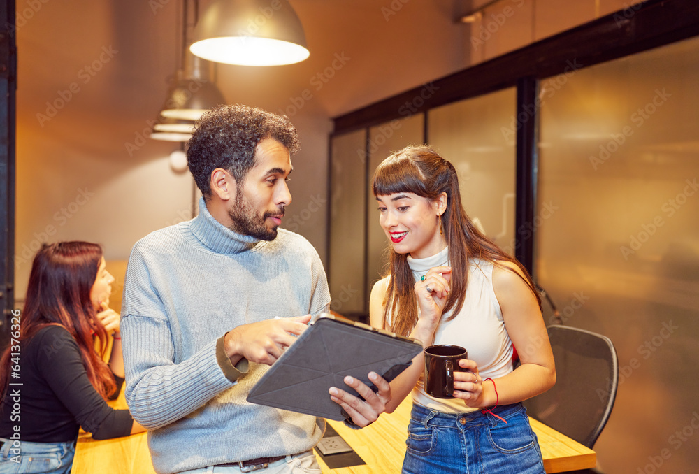 portrait two young people employees students in meeting room interior interacting with a digital tablet
