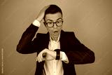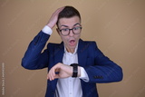 Stylish Young Man Expressing Tardiness, Glancing at Watch and Holding Head in Surprise on Isolated Background