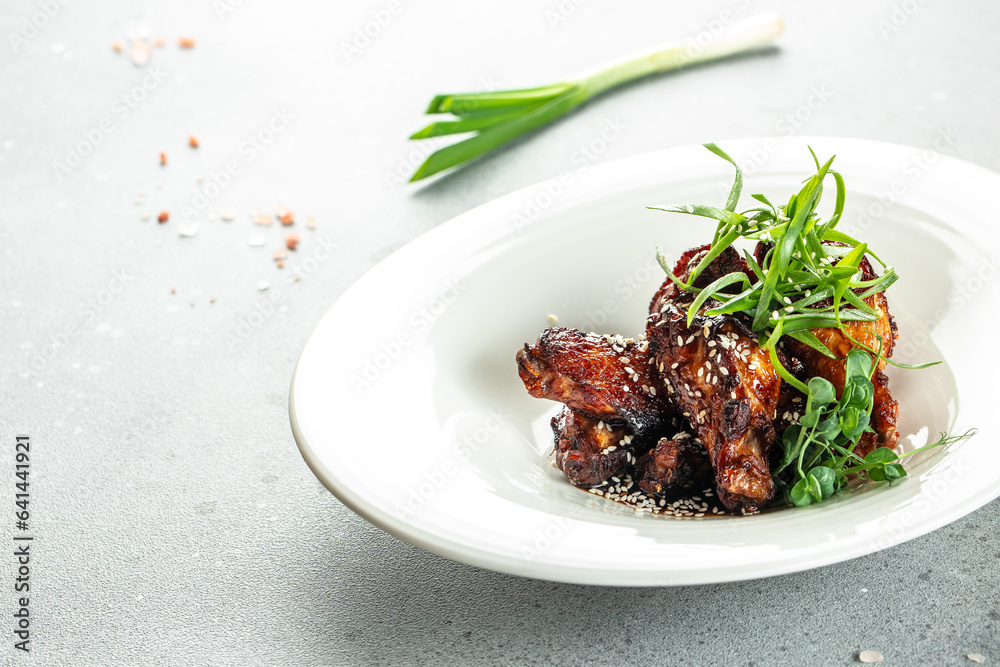 Roasted chicken wings in barbecue sauce with sesame seeds