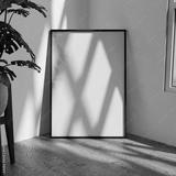 frame mockup poster on the wooden floor in the corner of the living room leaning on the white wall