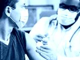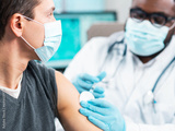 African-American doctor makes a coronavirus vaccine using a syringe and hypodermic needle. Professional medical worker and patient at the hospital office. Vaccination and safety.