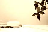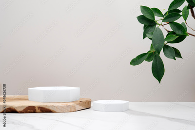 Product background with podium. Photo studio, beige backdrop, white marble table and natural wood support. Green plant and leaves, nature concept.