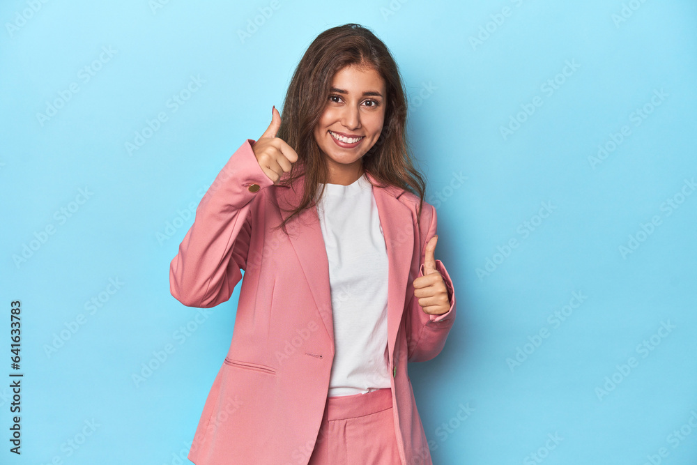 Teen girl in chic pink suit on a blue background raising both thumbs up, smiling and confident.