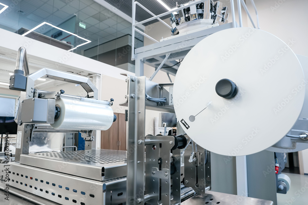 Processing of Packaging equipment thermoformer on food vacuum packaging sealing machine in industrial factory. Packing food in production line. Vacuum machine