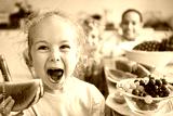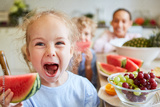 Cute girl screaming while holding watermelon slice