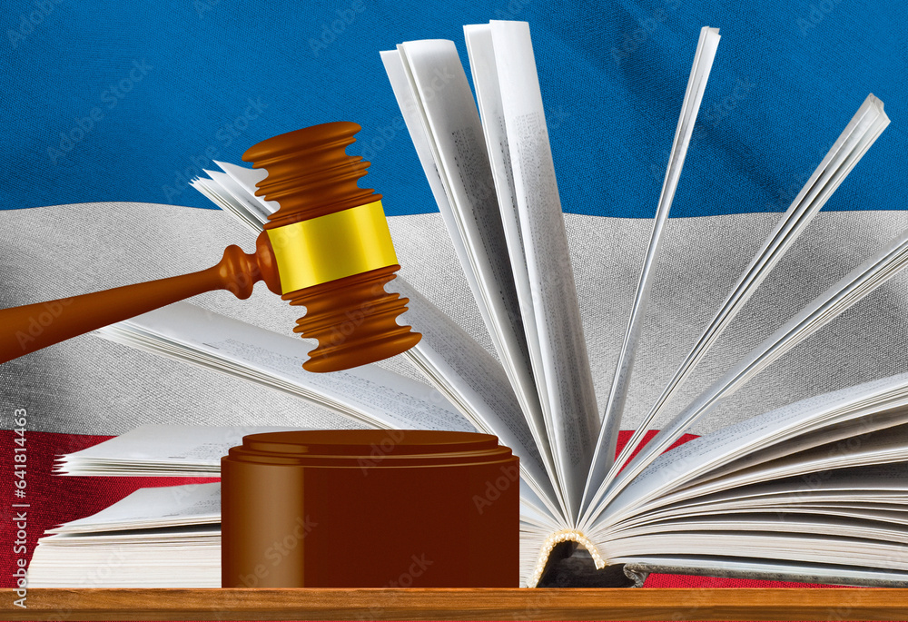 Judicial gavel on the background of an open book and the flag of Serbia.