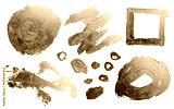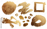 Gold bronze glitter brushstroke painting blot smear design elements. Abstract glow shine stain on white background.