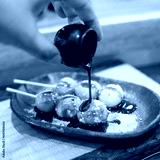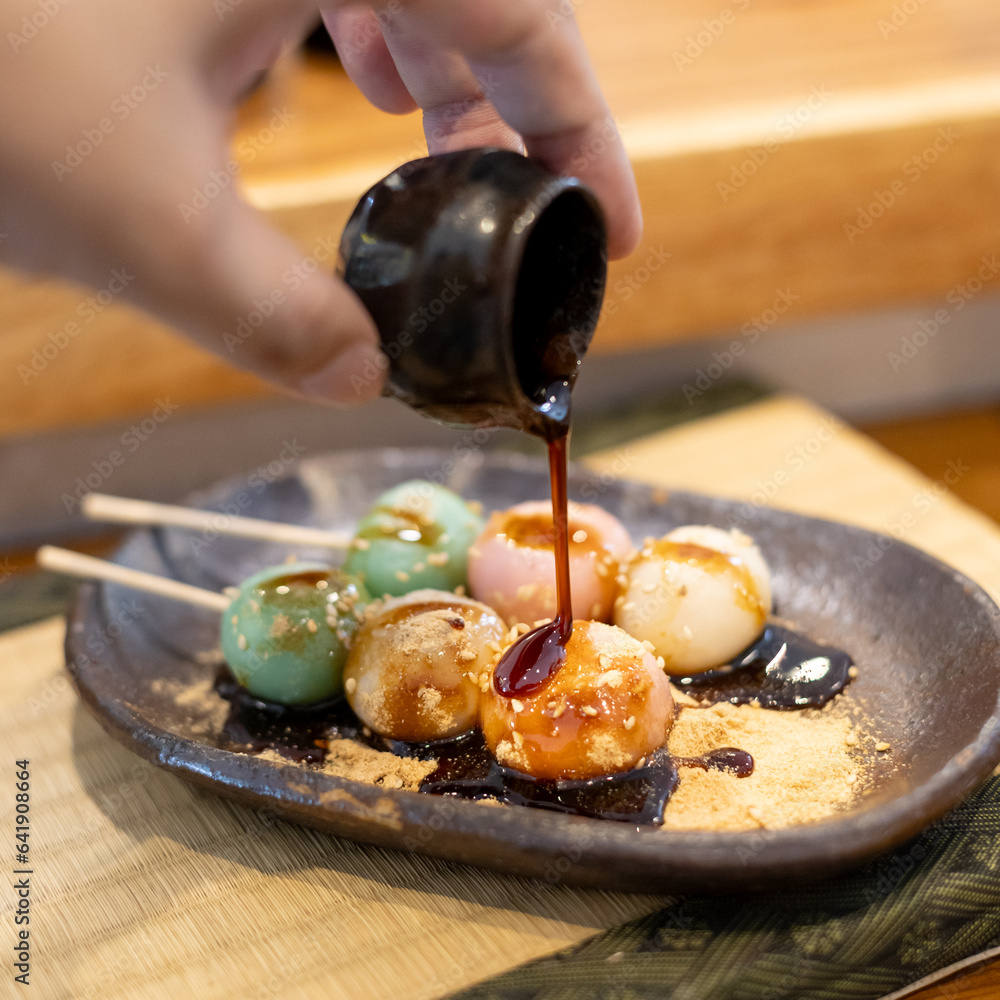 Dango, white pink and green japanese dessert on a skewer on a plate on tatami mat with hand pouring syrup on the dango
