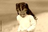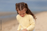 A little girl in a yellow sweater runs along the sandy beach. Blurred sea background. Happy vacation days
