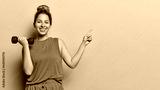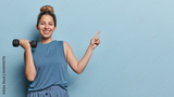Sporty concept. Studio shot of young pretty happy smiling European female standing on left isolated on blue background wearing tracksuit doing exercise using dumbbell pointing at space for promotion