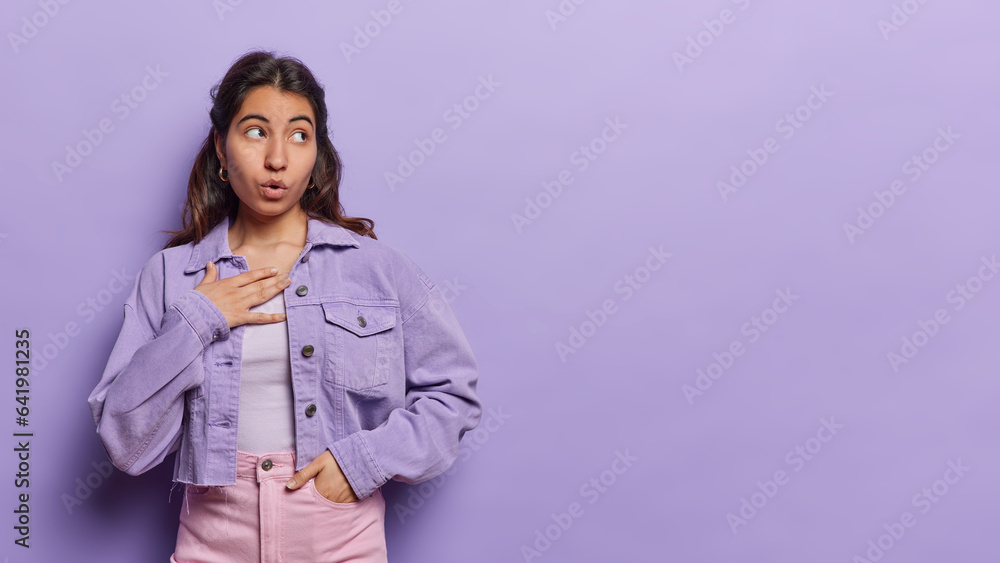 Horizontal shot of surprised Iranian woman with dark hair keeps hand on chest focused aside has stunned expression keeps hand in pocket wears jacket and pink trousers isolated over purple background