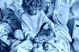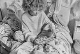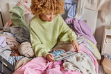 Young relaxed African american female in bedroom sitting in bed full of clothes weaing casual green sweater and white trousers holding tablet looking for some information on internet concentrated