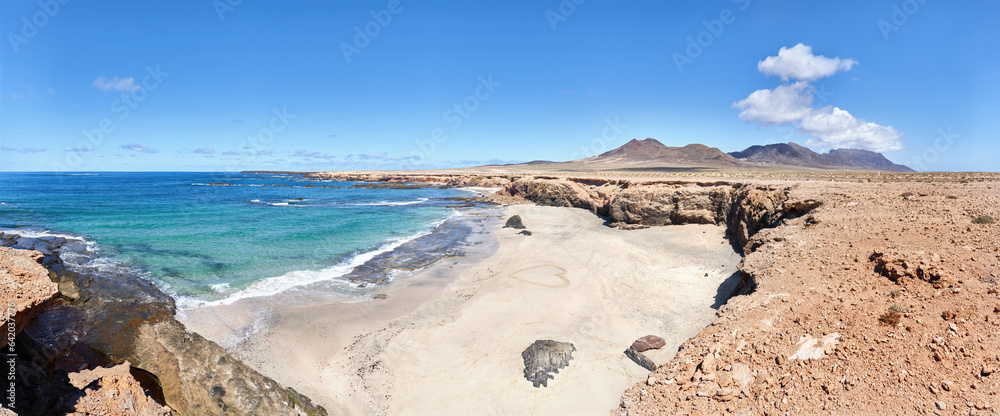 Strand Playa de los Ojos an der Südspitze von Fuerteventura, Kanarische Inseln mit einem riesigen Herz im Sand - Panorama Blick vom Plateau neben der Strasse bei Ebbe