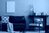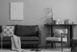 Creative composition of warm and cozy living room interior with mock up poster frame, brown sofa, round coffee table, boucle armchair, simple consola and personal accessories. Home decor. Template.