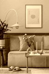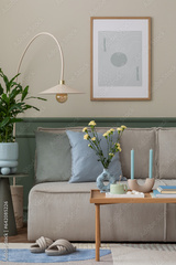 Cozy composition of stylish living room interior with mock up poster frame, modular sofa, wooden coffee table, blue pillows, slippers, plant and personal accessories. Home decor. Template.