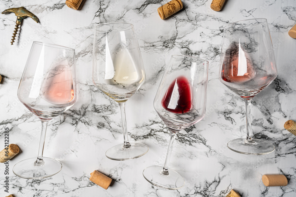 Wineglasses with red, pink and white wine on white calacatta background with copy space
