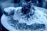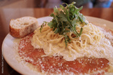 Selective focus, Truffle tagliatelle pasta on carpaccio beef.