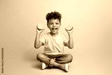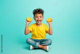 Full length photo of good mood small boy with brown hair wear stylish t-shirt sit hold sliced orange isolated on teal color background