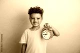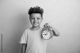 Portrait of good mood cheerful small boy with curly hairstyle wear stylish t-shirt hand holding clocks isolated on teal color background