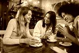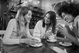 Three female drinking coffee sitting in a table of a cafe. Friends group drinking cappuccino at bar. Women talking and having fun together at fancy cafeteria. Friendship concept with happy girls