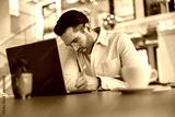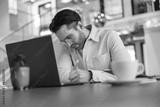 Handsome businessman working on project while using laptop and making notes while sittting in office