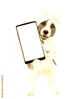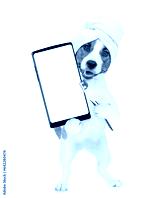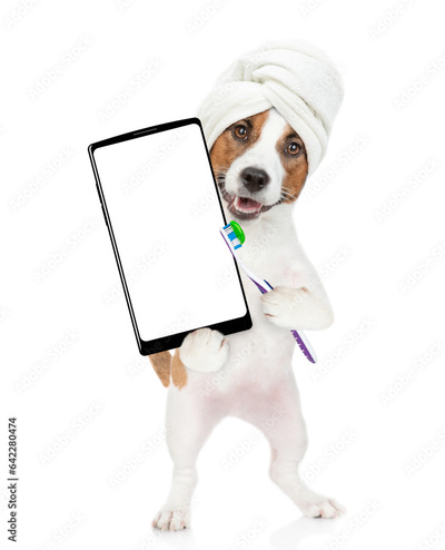 Funny Jack Russell terrier puppy with towel on it head holds toothbrush and holds big smartphone with white blank screen in it paw. isolated on white background