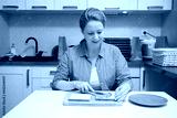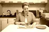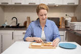 A woman preparing a peanut butter sandwich in the kitchen, carefully spreading the creamy butter on a slice of white bread