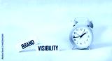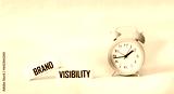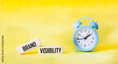 Brand visibility symbol. Wooden blocks with words.Yellow background with a clock. Copy space.
