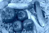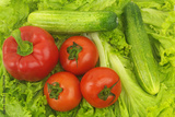 Pepper, tomatoes and cucumbers on green salad leaves. Fresh vegetables background.