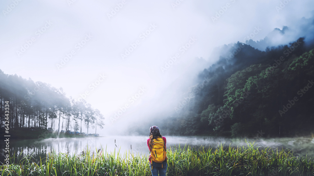 Young women travel to take pictures of beautiful natural forests, Pang Ung and pine forests in Mae Hong Son province, Thailand.