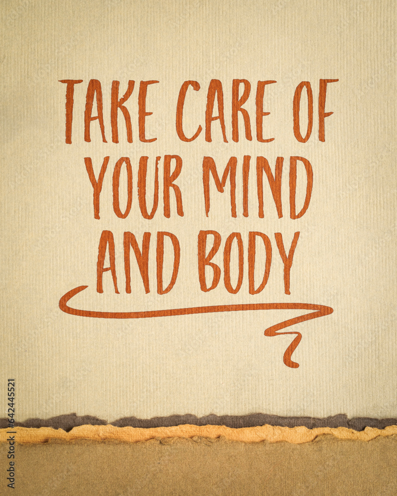 take care of your body and mind - motivational note on art paper, fitness and self care concept