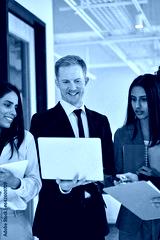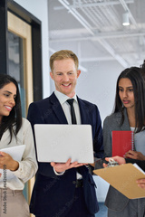 International professional business team people using laptop standing in office. Busy diverse workers group looking at computer discussing digital project plan in teamwork in hallway. Vertical