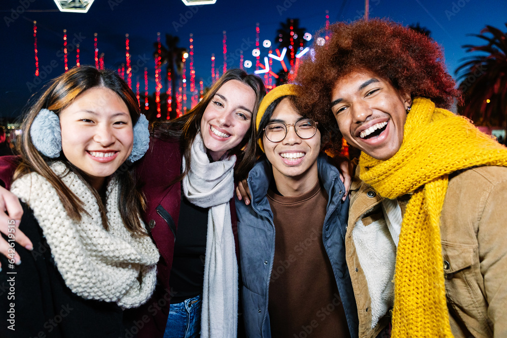 Multiracial group of young people smiling at camera standing together outdoors. Happy millennial friends enjoying winter vacation