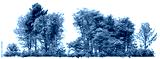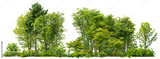 Cutout tree line. Forest and green foliage in summer. Row of trees and shrubs isolated on transparent background. Forest scape. High quality clipping mask