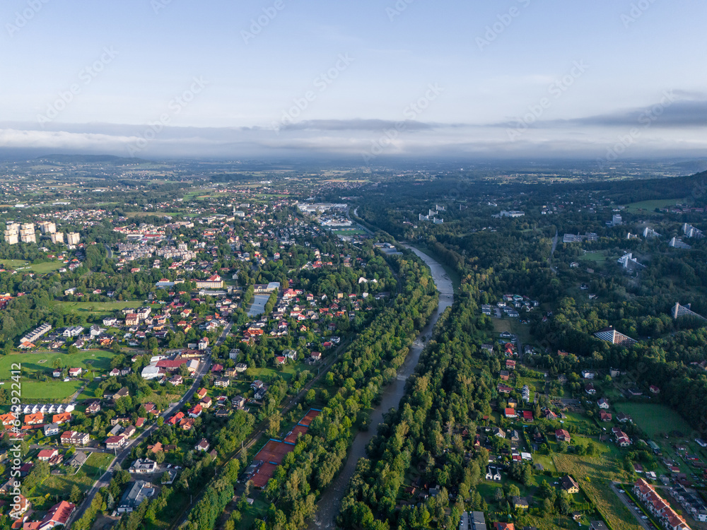 Ustron Aerial View. Scenery of the town and health resort in Ustron on the hills of the Silesian Beskids. Poland.
