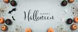 Halloween holiday background with party decorations from pumpkins, bats, ghosts, spider webs on blue top view. Greeting card with text inscription Happy Halloween in banner format..