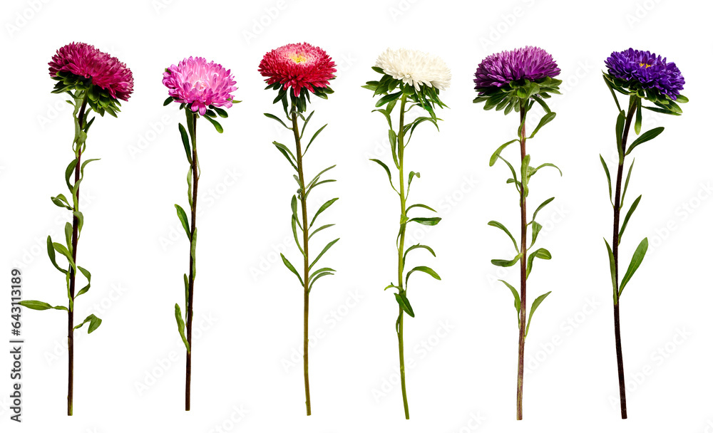 Six multicolored asters isolated on a transparent background. Set of elements for creating collage or design, postcards, invitations