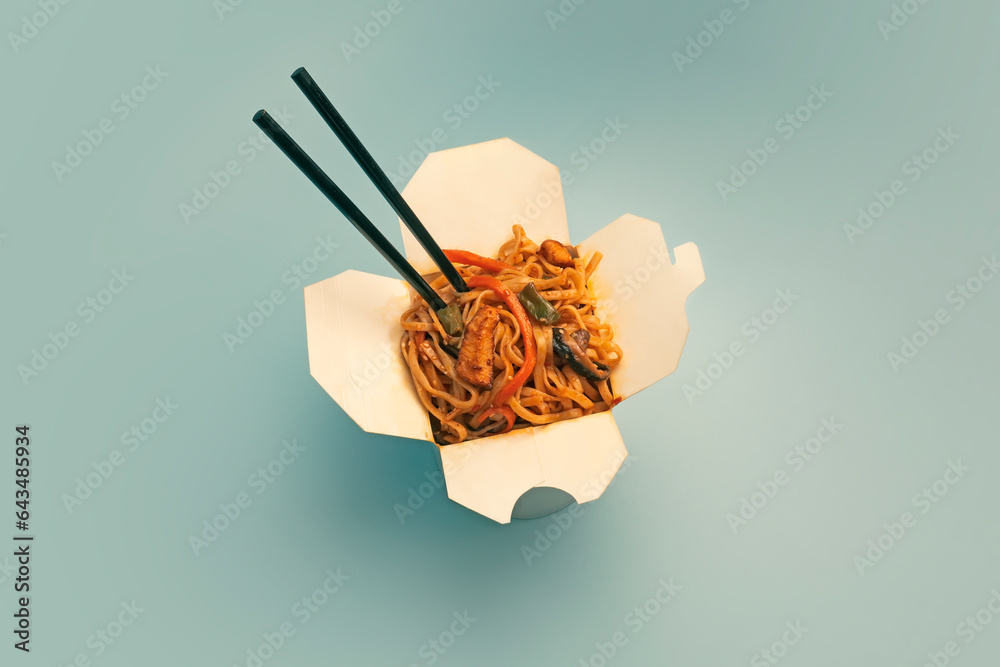 Korean noodles in white box on bright blue background color.