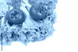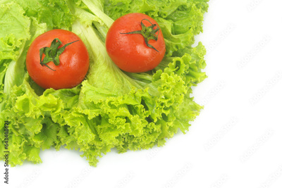 Two tomatoes on salad leaves isolated on white background.
